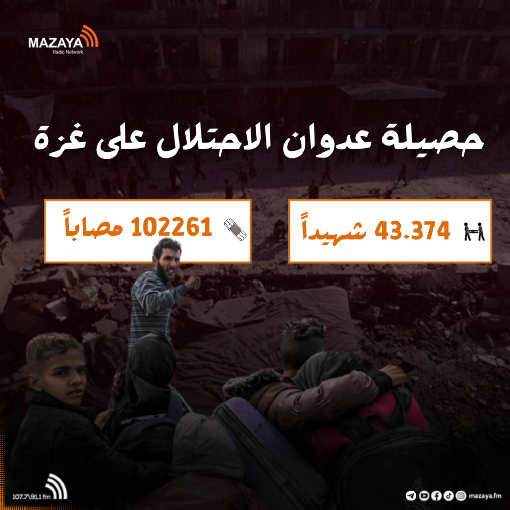 ارتفاع حصيلة عدوان الاحتلال على غزة إلى 43374 شهيدا و102261 مصابا