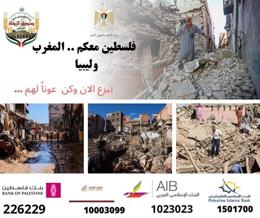 وكان وزير الأوقاف، قد أعلن الأحد الفائت عن إطلاق حملة لإغاثة منكوبي الإعصار في ليبيا، والزلزال في المغرب، من خلال جمع التبرعات في المساجد بعد صلاة يوم الجمعة، أو من خلال التبرع على أرقام حسابات صندوق الزكاة الفلسطيني.