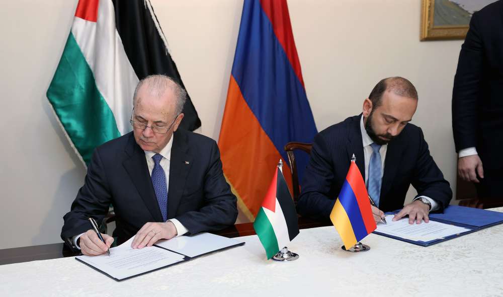 نيويورك 28-9-2024 - وقع رئيس الوزراء وزير الخارجية محمد مصطفى، مع وزير خارجية أرمينيا أرارات ميرزويان، إعلانا مشتركا بشأن إقامة علاقات دبلوماسية ما بين دولة فلسطين وجمهورية أرمينيا.