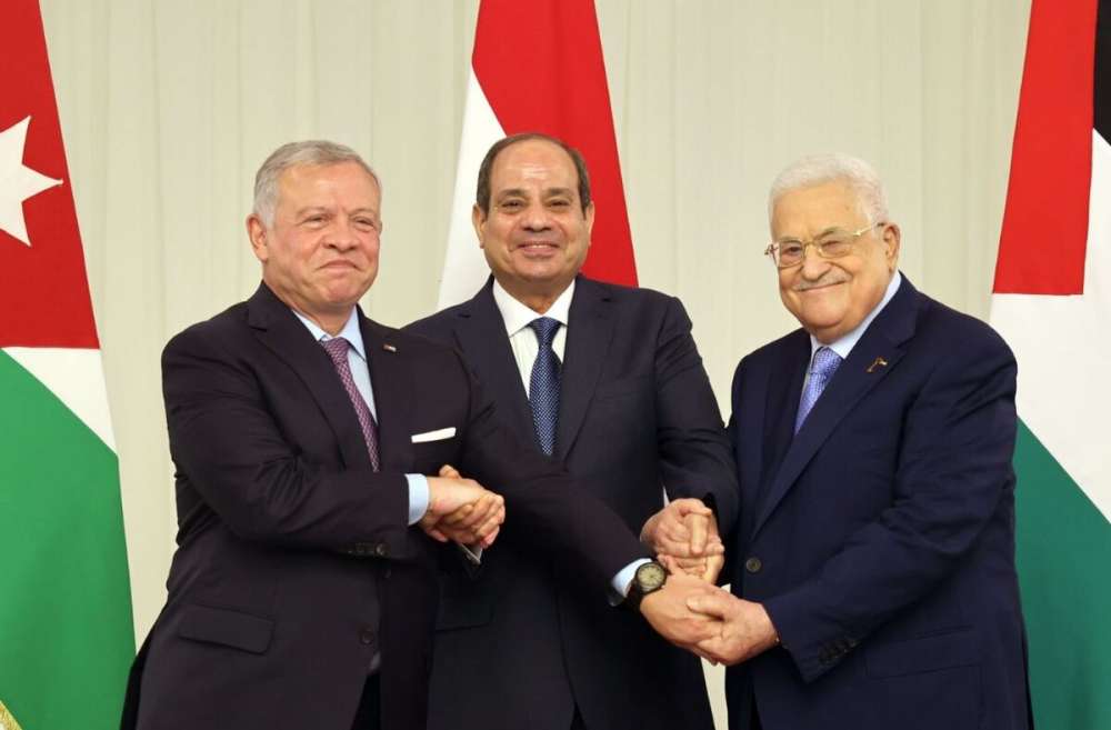 وأكد القادة في بيان ختامي على الأولوية التي توليها الدول الثلاث للمرجعيات القانونية، الدولية والعربية لتسوية القضية الفلسطينية، وعلى رأسها ضرورة إنهاء الاحتلال الإسرائيلي لأرض دولة فلسطين، ضمن جدول زمني واضح، واستعادة الشعب الفلسطيني لكامل حقوقه المشروعة، بما في ذلك حقه في تقرير المصير، وفي تجسيد دولته المستقلة وذات السيادة على خطوط الرابع من يونيو/ حزيران لعام ۱۹٦٧ وعاصمتها القدس الشرقية، وحل قضية اللاجئين الفلسطينيين وفق قرارات الشرعية الدولية، وتحقيق حل الدولتين وفق المرجعيات المعتمدة.