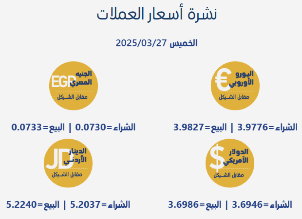 أسعار صرف العملات المتداولة في السوق الفلسطينية لليوم