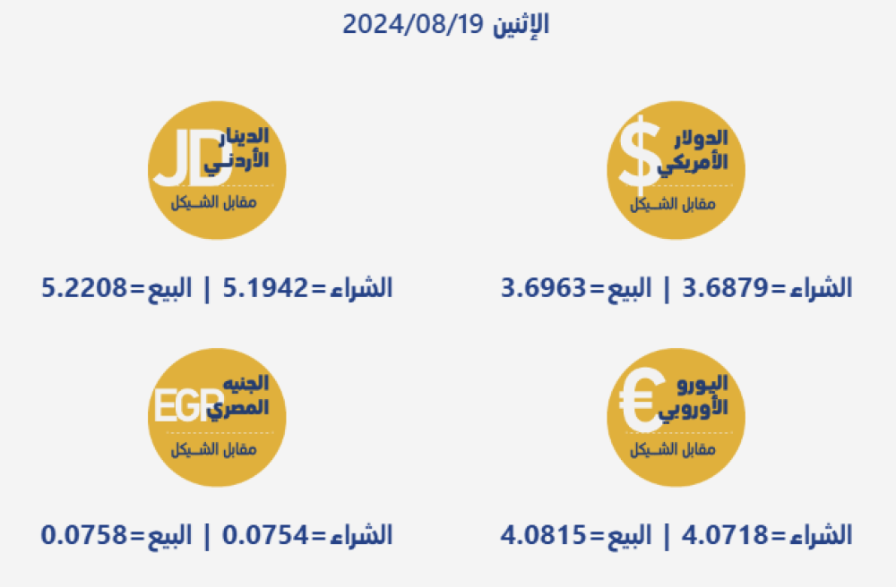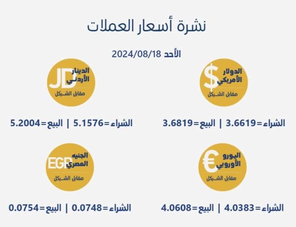 أسعار صرف العملات مقابل الشيقل بحسب سلطة النقد الفلسطينية اليوم الأحد